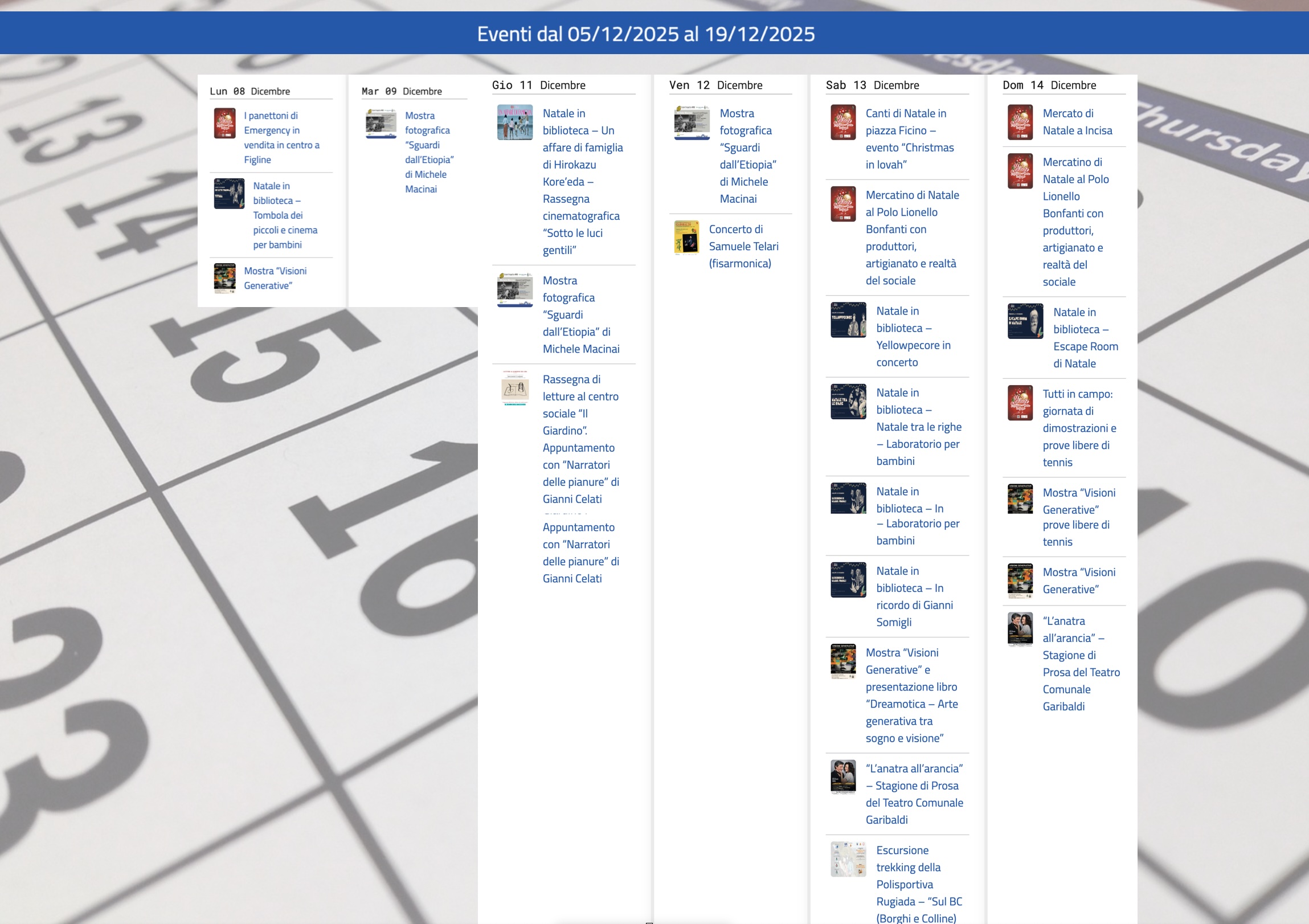 Nel fine settimana tanti appuntamenti dedicati al Natale e non solo. Sabato 13 dicembre si terrà l'escursione trekking della Polisportiva Rugiada, aperta a tutti coloro che amano le camminate, con ritrovo ai giardini Nano Campeggi di Bagno a Ripoli alle 9,30 (prenotazione obbligatoria entro l’11 dicembre al 3202616045 o alla mail info@polisrugiada.org). Il pomeriggio, alle 16, in piazza Marsilio Ficino sarà possibile assistere ai canti di NataleChristmas in Lovah”, un’esibizione dell’Associazione Paro Paro in favore di Andos Valdarno, mentre al Polo Lionello Bonfanti di Burchio - Incisa, dalle 10,30 alle 19,30, è in programma un mercatino con produttori, artigianato e realtà del sociale a cura di Salve! Health to share odv. L’appuntamento, ribattezzato “Erba Brusca del Burchio”, si ripeterà, nella stessa fascia oraria, anche domenica 14 dicembre.Per la rassegna “Natale in biblioteca” sono invece previsti 4 appuntamenti, tra sabato e domenica, divisi tra la biblioteca Rovai di Incisa e la Marsilio Ficino di Figline. Alla biblioteca Rovai, alle 10 di sabato 13 dicembre, si svolgerà il laboratorio per bambini “Natale tra le righe”, una mattina di letture e creatività per accogliere l’atmosfera del Natale, con la realizzazione finale di un’opera con materiali di recupero. Successivamente, alle 11,30, verrà assegnato un piccolo riconoscimento dedicato ai giovani lettori più appassionati, voluto dalla famiglia di Gianni Somigli per ricordare lo scrittore incisano scomparso nel 2023.