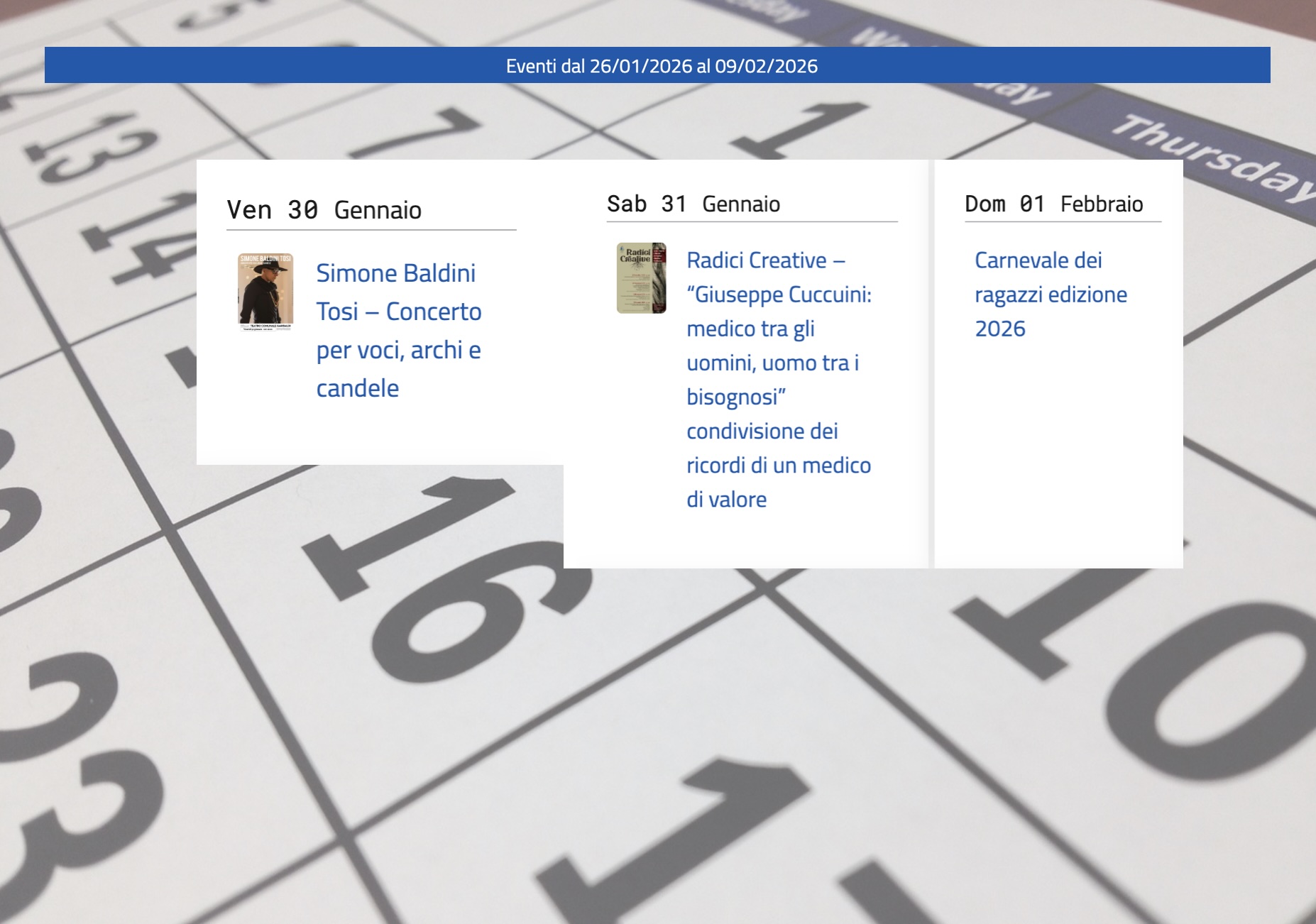 Dolci melodie che si innestano in un’atmosfera intima e fuori dal tempo, incontri commemorativi e appuntamenti legati al Carnevale. Questi gli appuntamenti della settimana a Figline e Incisa Valdarno, promossi dal Comune o realizzati grazie al suo sostegno. Il primo è in programma venerdì 30 gennaio, alle 21, al teatro Garibaldi, dove all’interno del Foyer si terrà il concerto per voci, archi e candele del musicista, autore, cantante e compositore Simone Baldini Tosi. Un appuntamento intimo e coinvolgente, dove la voce dell’artista si fonderà con il suono degli archi in una scenografia calda e suggestiva, illuminata da candele. Il repertorio musicale spazierà tra grandi classici italiani e internazionali, fino a brani originali. Un concerto non solo da ascoltare ma anche da vedere e da sentire dentro, un momento sospeso tra poesia, luce e silenzio. Per i biglietti è possibile recarsi alla biglietteria del teatro, nei punti vendita Box Office Toscana o sulla piattaforma online di TicketOne.