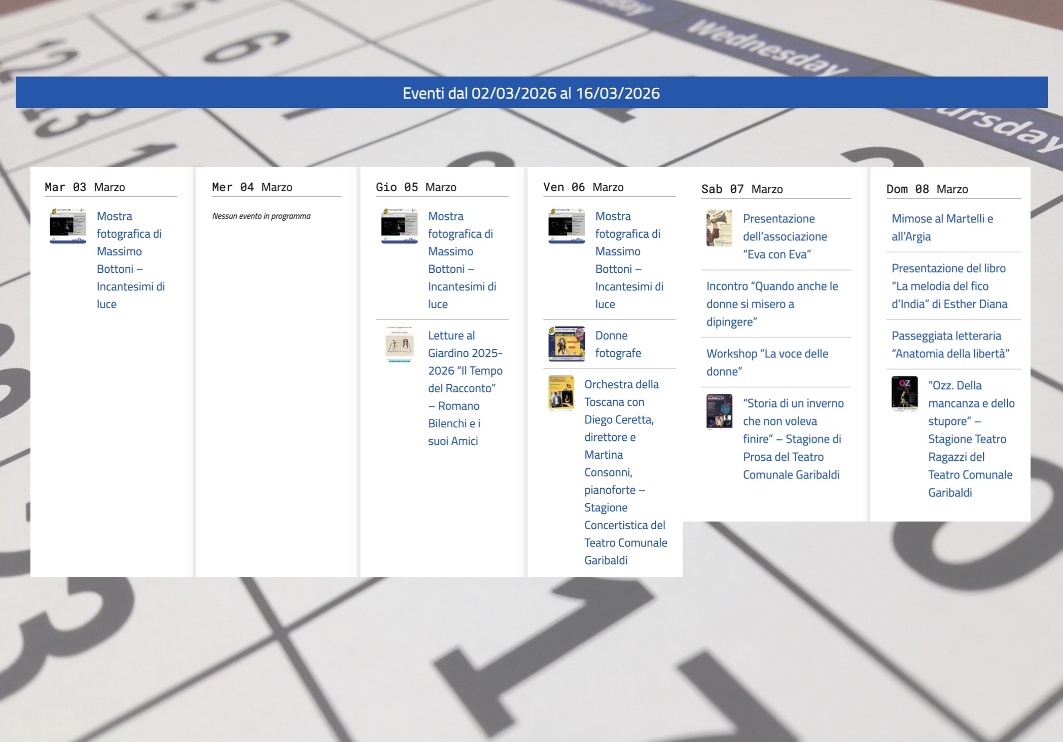 Mostre, concerti, spettacoli per bambini e ragazzi ed appuntamenti dedicati alla Giornata internazionale della donna. Sono questi i temi degli eventi della settimana a Figline e Incisa Valdarno, promossi dal Comune o realizzati grazie al suo sostegno.