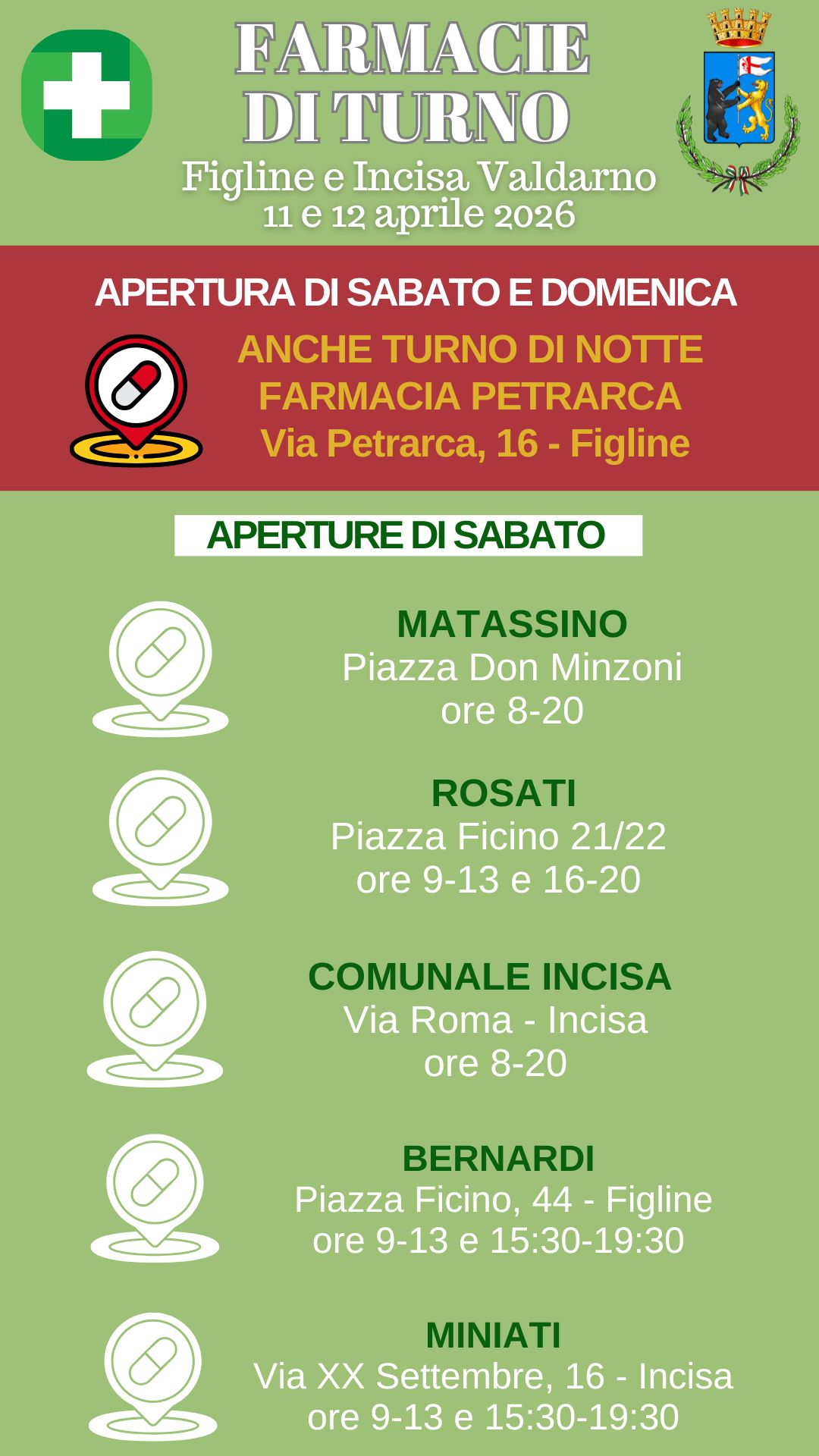 Ecco di seguito le farmacie di turno aperte sabato 11 e domenica 12 aprile a Figline e Incisa Valdarno.