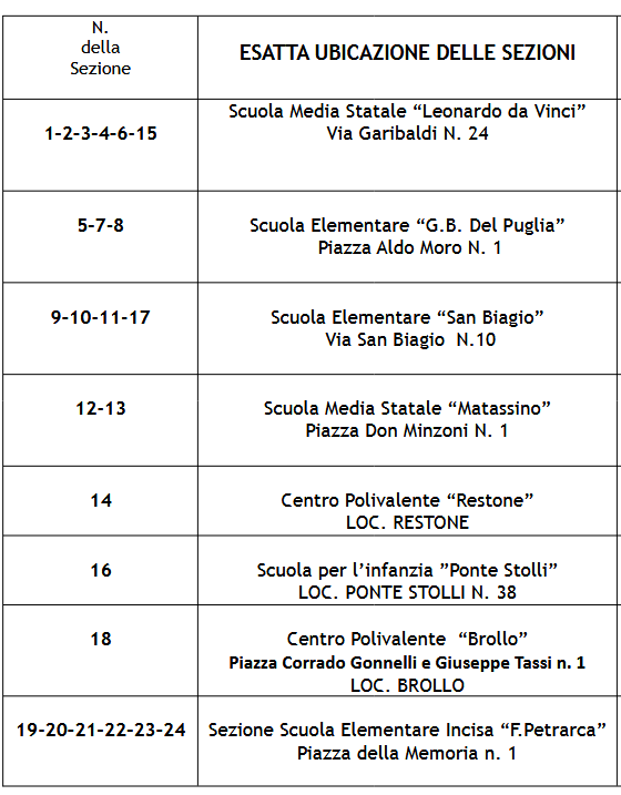 Di seguito la lista e l'esatta ubicazione delle sezioni elettorali comunali